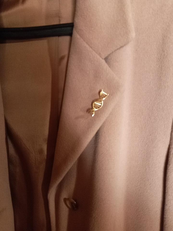 Okouzlující, lakonická brož. Kabát perfektně sedí.