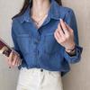 Women Fashion Casual Jeans Shirt Turn Rolled Up Long Sleeve Down Collar Denim Jacket with Pockets
