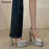 Krazing Pot Sequin Cloth Spring Autumn Size 43 Women Platform Super High Heels Women Round Toe Toe Ankle Straps Bling Shiny Pumps