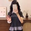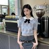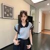 Women's Gray Peter Pan Collar Knit Top – Short-Sleeve, Summer, Fashionable Two-Piece Design