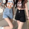 Women's High-Waist Black Double Buckle Denim Shorts - A-Line Petite Summer 2025 Trend