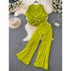 V Neck Jumpsuits for Women Long Puff Sleeve Belt Design Loose Wide Legs Pleated Pants Streetwear Fashion OL Bodysuits