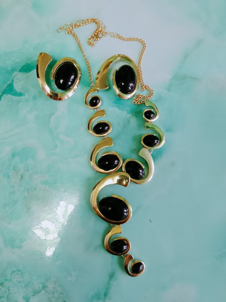 1 Sada Boho Klasická 2ks Dámská šperková sada, Tvar spirály šneka s černou kamínkovou intarzií, Y-náhrdelník a náušnice