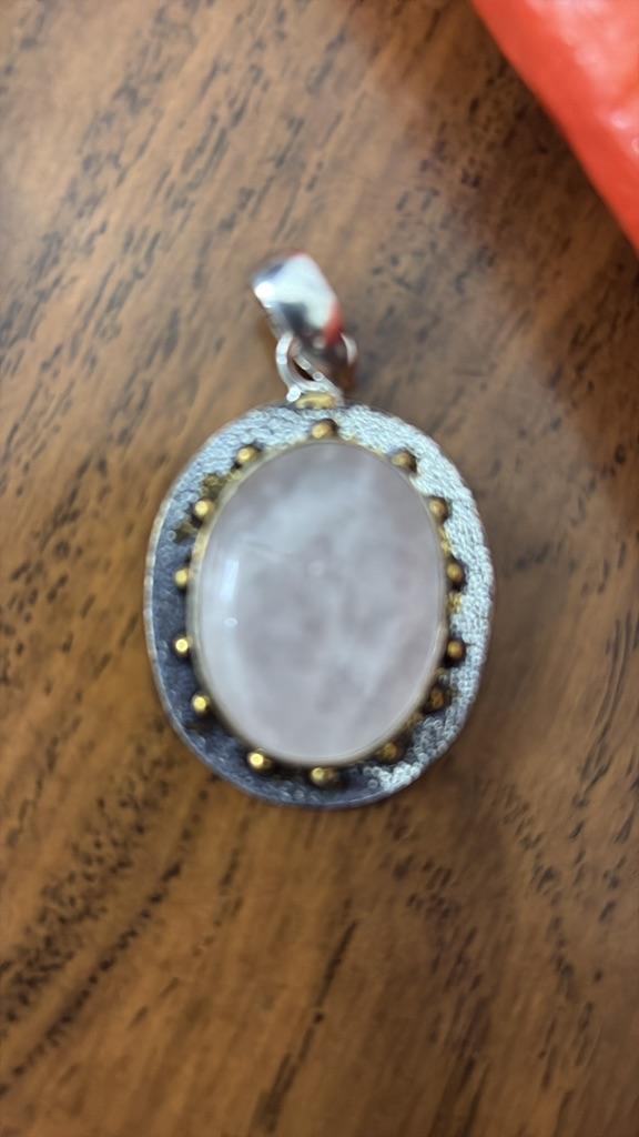 Natural Rose Quartz Gemstone 925 Sterling Silver Two Tone Pendant 2.09" Z9h51