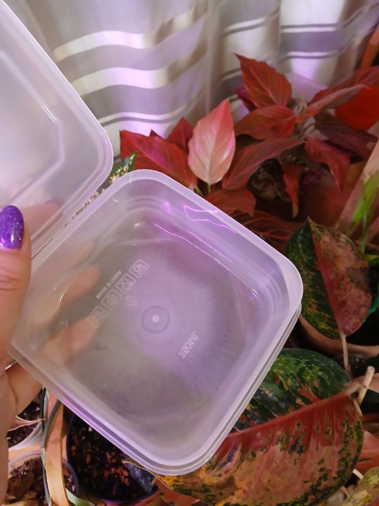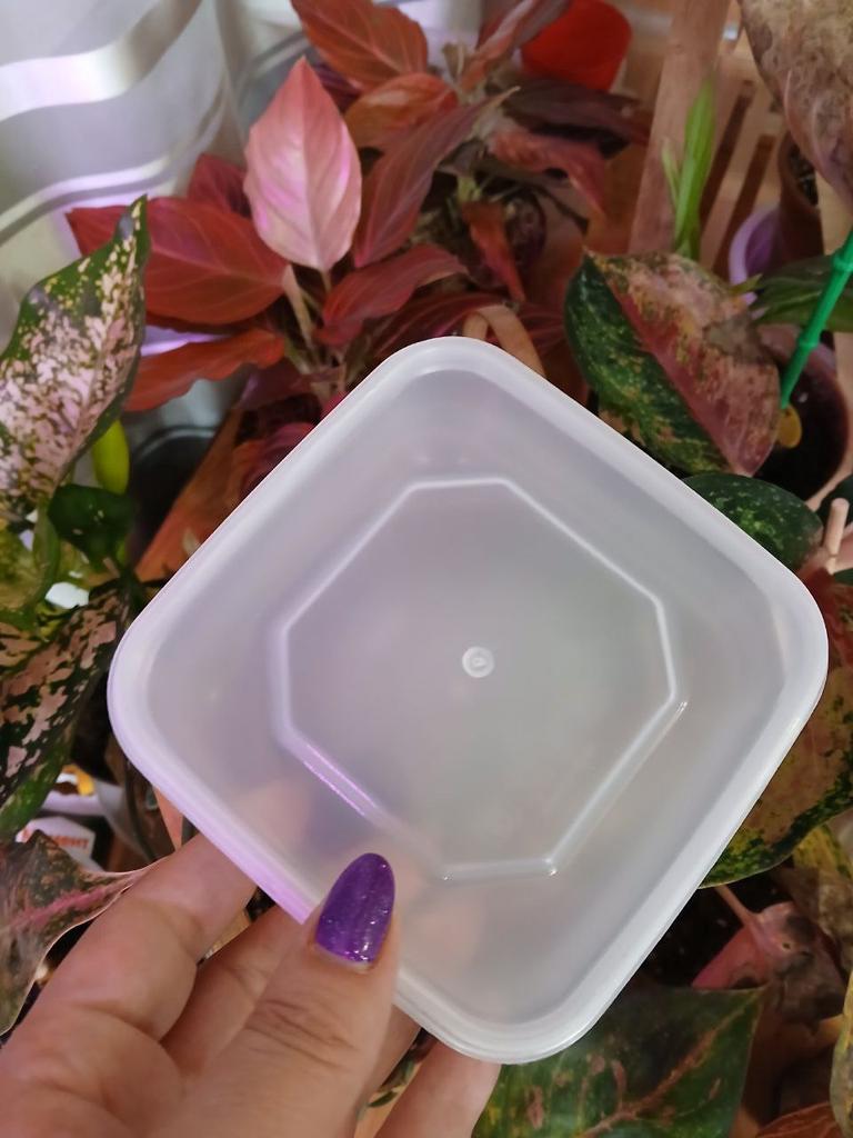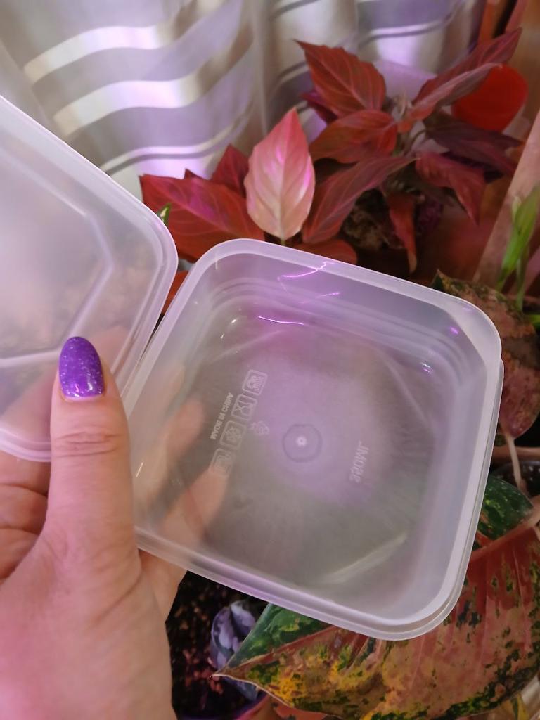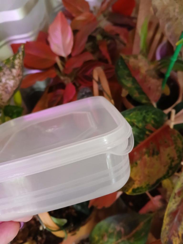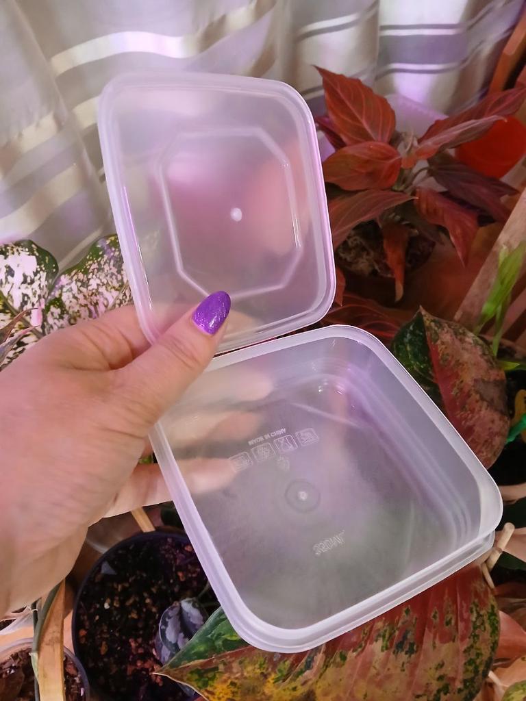 Simple plastic container You can buy 1 piece, or you can buy several. No foreign smell. The lid fits tightly to the container and does not come off. Size 12*12*4 cm