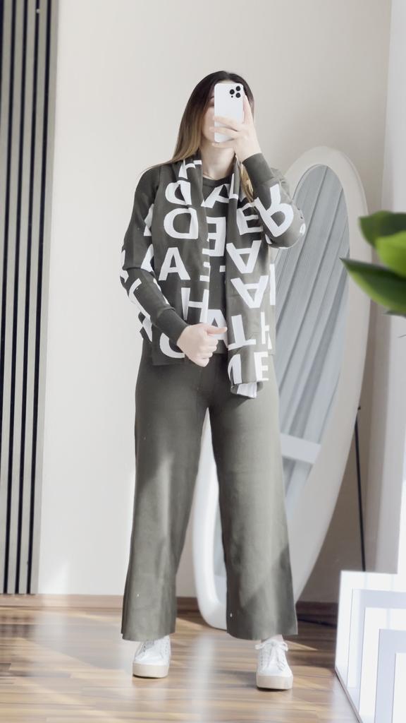 Høst og vinter strikket tredelt dress for kvinner Langermet strikket topp Bukser med brede ben Skjerf Uformell mote Temperament Tredelt dress