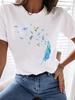 Boho Chic Feather & Bird Graphic Tee Women’s Short Sleeve Summer Top White Crew Neck T-Shirt with Blue Feather Painting